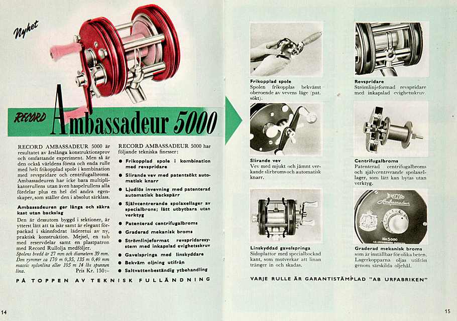 This is a significant reel as it was the first to have a three speed gear mechanism activated on the winding handle. It was a big heavy reel, weighing 380g, and having a capacity of 260m of .30mm monofilament and was very expensive for the day, being 160 sek when its predecessor Record 1000 cost only 110 sek.
