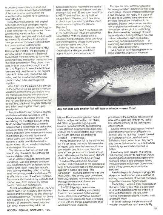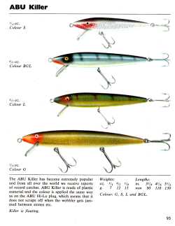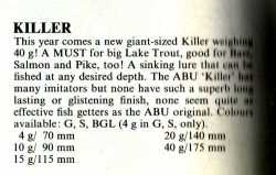 The passage of 3 decades production never allows the ABU Killer to be forgotten for its long term fish catching qualities, even if more modern authors from Modern Fishing 1984, do manage to get some things wrong like what it was made from. ABU Killers were always made of plastic in the 50's to mid 80's, NOT Balsa wood!