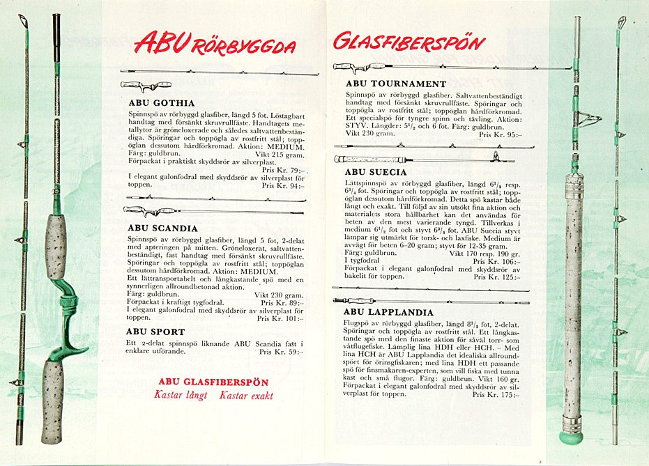 The ABU Gothia, Scandia, Sport, Tournament, Suecia were the first offering for light fiberglass spinning rods in 1952.